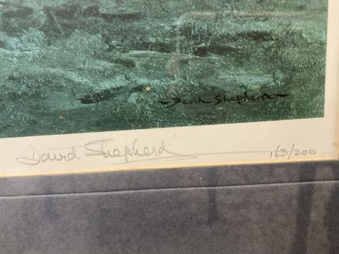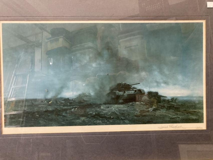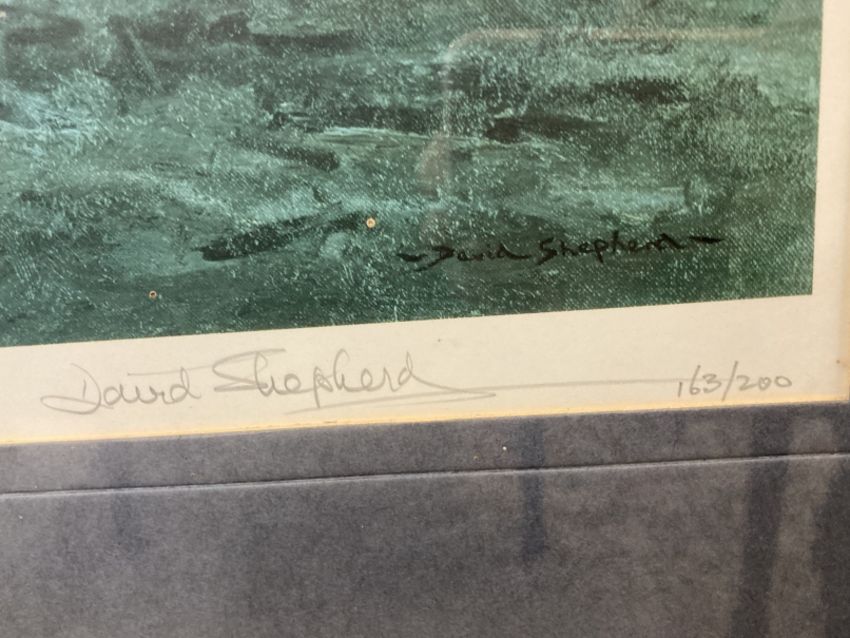 David Shepherd: Limited edition colour print depicting the action of the Royal Wiltshire Yeomanry at El Alamein, 163/200, signed in pencil, framed and glazed. 11½ins. x 22½ins.