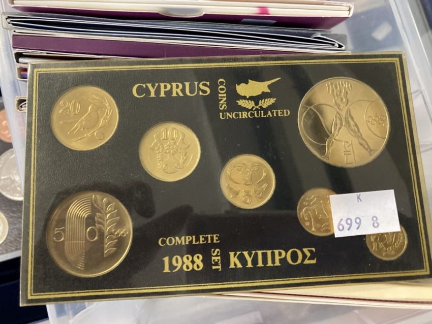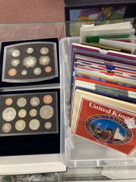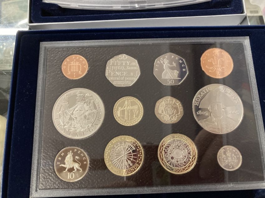 Numismatics: GB Presentation Packs, Royal Mint Proof sets, coins for the New Millennium 2000, 2005 Proof set including Trafalgar £5, Nelson £5, Gunpowder Plot £2, Johnsons 50p, fourteen Brilliant uncirculated Year Coin Collections 1985 - 6, 1995 - 2005 ('96 x 2), eleven uncirculated coin sets for Italy, Jersey, Hong Kong, USA, Guernsey, etc. Twenty nine in total. Plus a collection of twenty six Elizabethh II Crowns.