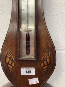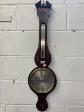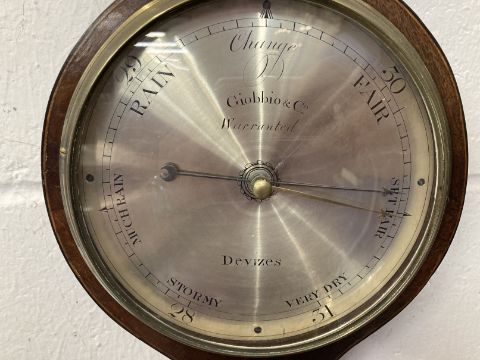 Scientific Instruments: 19th cent. Oak cased barometer with floral and seashell fruitwood inlays. Signed Giobbio & Co. Devizes. Dial 8ins. Thermometer 11½ins. Case 38ins.