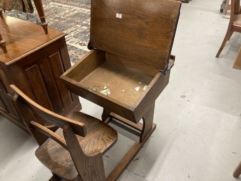 Pre-war oak and elm adjustable flip top child's school desk and bar back chair.
