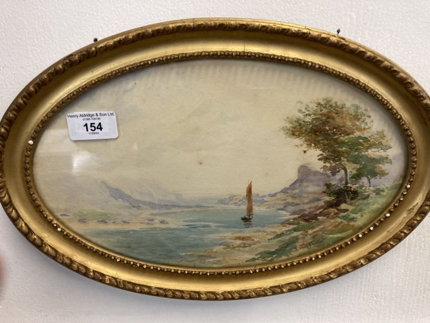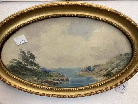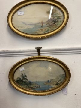 T.I. Hallett: 19th cent. Watercolours on paper, oval form, sailing boats in a coastal scene, both framed and glazed. 12ins. x 7¼ins. (2)