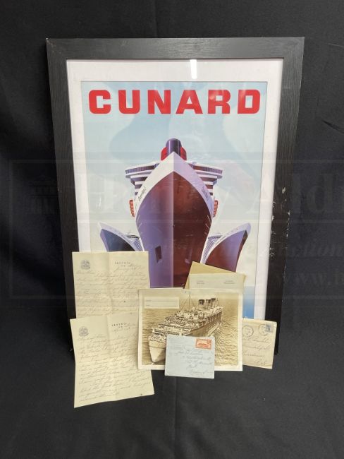 OCEAN LINER: Mixed collection to include Berengaria stationery, letters written onboard P&O S.S. Malta, S.S. Medina and a Queen Mary 2 poster. 15ins. x 23ins. (14)