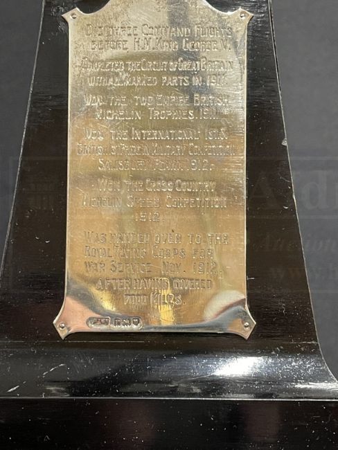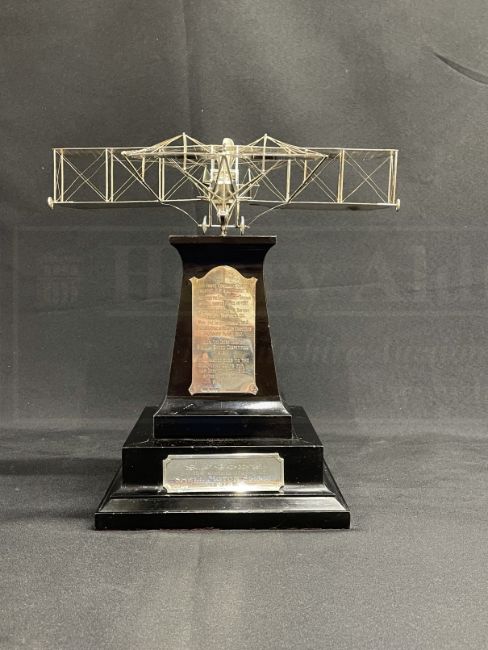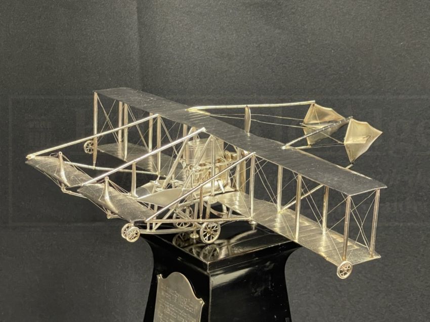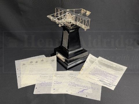 EARLY AVIATION PIONEERS/THE SAMUEL CODY ARCHIVE: Extremely important solid silver The Shell Motor Spirit Trophy, 1912, by Mappin and Webb, hallmarked London 1912, with fine model of Cody's Flyer, Type No. V, mounted on a stepped wooden plinth with two plaques, the first inscribed Presented To S.F. Cody by the distributors of "Shell" Motor Spirit 1912., the other Did Three Command Flights Before H.M. King George V. Completed The Circuit Of Great Britain With All Marked Parts In 1911. Won The Two Empire British Michelin Trophies. 1911. Won The International 1st. & British 1st. Prize In Military Competition Salisbury Plain. 1912. Won The Cross Country Michelin Speed Competition 1912. Was Handed Over To The Royal Flying Corps For War Service. Nov. 1912. After Having Covered 7000 Miles, with related letters from the British Petroleum Company Limited to Cody, one dated 7th Dec:12, and stating, '...The silver model of your Biplane is finished, and is on view at Messrs. Mappin & Webb's, Oxford Street, W...', the reverse with Cody's reply drafted in pencil, together with further correspondence from British Petroleum, Mappin and Webb and The Grahame-White Aviation Company . A unique piece of aviation history. The trophy measures 13¼ins. high overall, with bespoke ebonised glazed display case.
