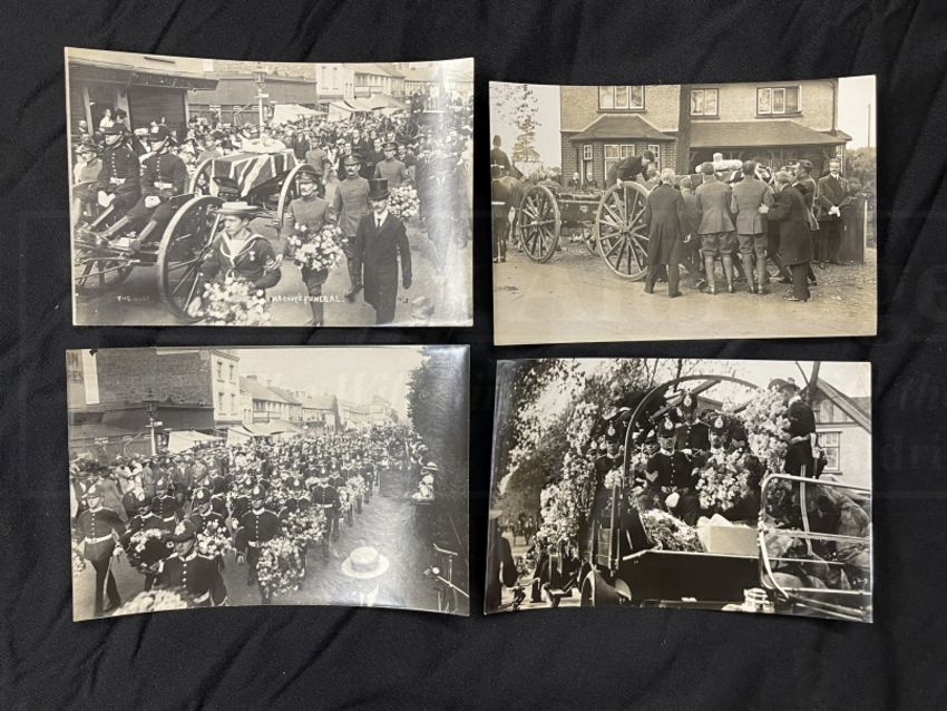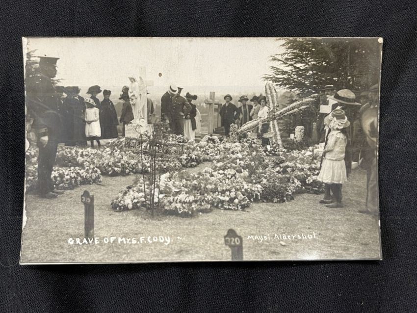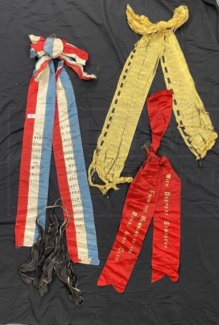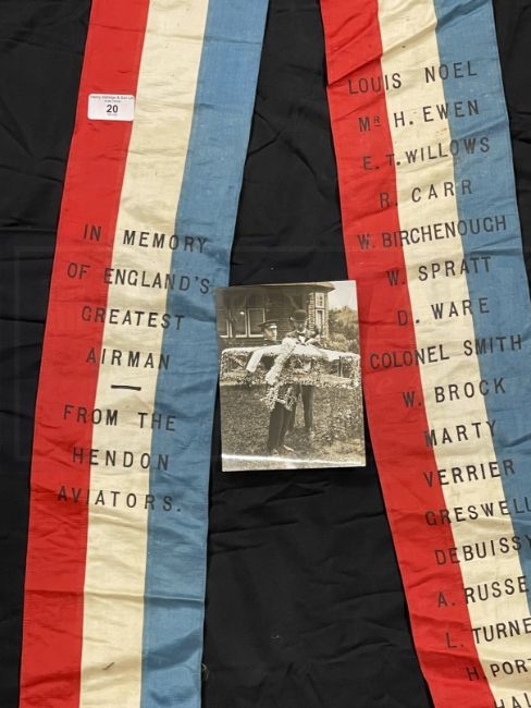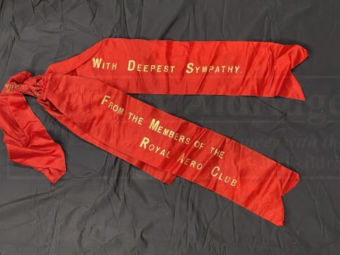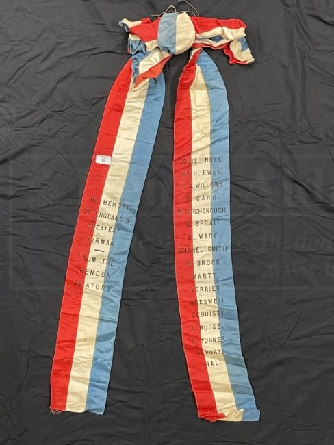 This lot includes original silk sash/ribbons retained by the family from some of the floral wreaths given by, among others, Hendon Aviators 'In Memory of England's Greatest Airman', The Royal Aero Club, and a gilt ribbon bearing the names of prominent early aviators. Also included period photographs and postcards of the funeral, one which we believe shows The Hendon Aviators memorial wreath in the shape of a bi-plane with the above sash on the wreath.