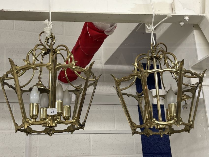 20th cent. Lighting: Pair of unglazed brass octagonal lanterns each with four lights and glass shades. 16ins. x 16½ins.