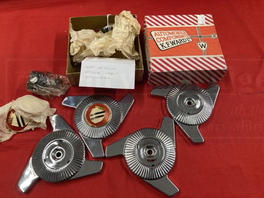 Automobilia: Set of four MK II 1950s Styla Spinners in original box by Automobile Components K.F. Ward Ltd comprising four chrome plated brass spinners, four anodised aluminium medallions, eight anti-rattle rubber washers and four nut and bolt sets.
