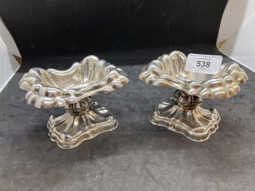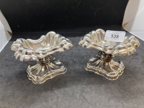 19th/20th cent. Pair of white metal rectangular shaped salts, scrolled pattern tests as silver, Scandinavian marks. Weight 6.60oz.