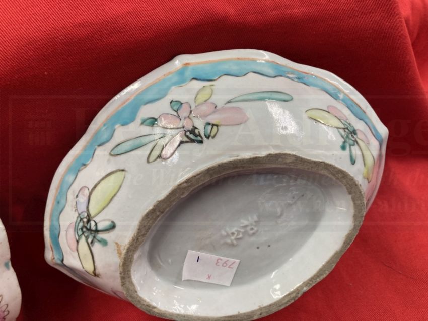 Chinese Nyonya Straits porcelain shaped bowl decorated with a chicken and flowers. 6¾ins. Plus an oblong shaped bowl decorated with flowers, raised mark to the base. 8¼ins. x 6¼ins.