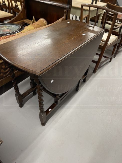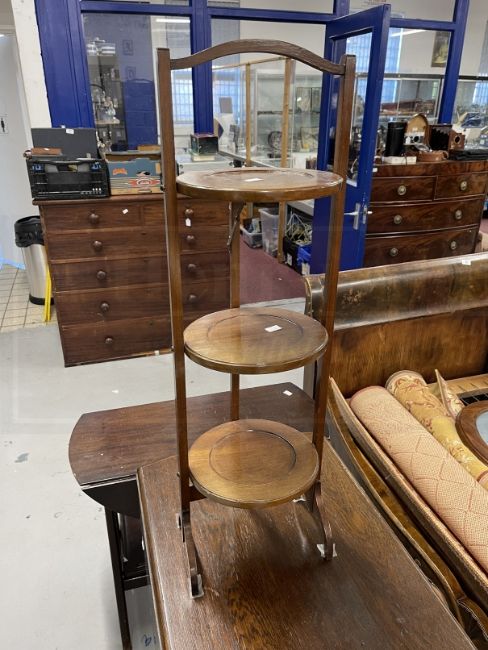 1920s oak barley twist drop leaf table. 30ins. x 55ins. x 42ins. Plus a three tier Edwardian cake stand and a flap[ top table with an under shelf. (3)