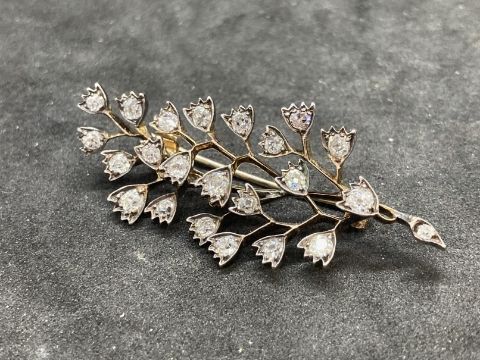 Jewellery: Yellow metal brooch in the form of a spray set with twenty-three old cut diamonds, estimated weight of (23) 0.75ct. Tests as 14ct gold. Weight 5.4g.