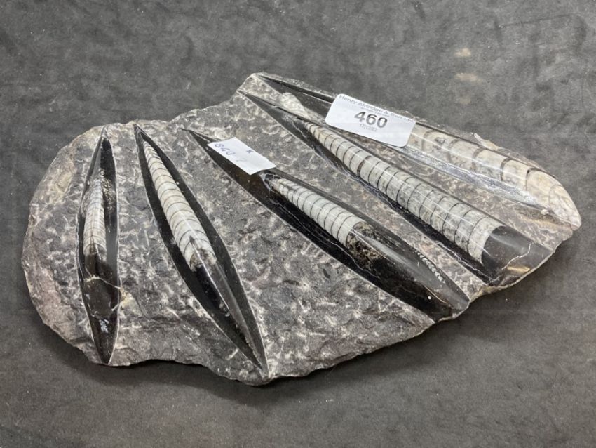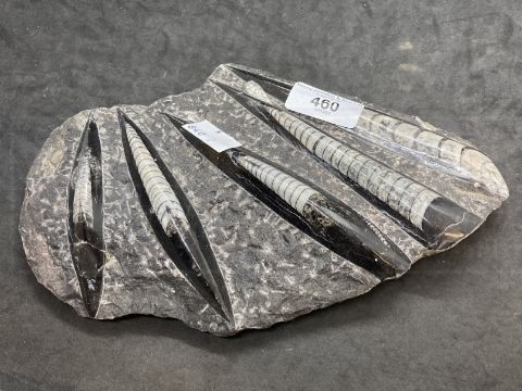 Fossilized Shells: Belemnite black with grey and white horizontal markings, dark grey background. (5)