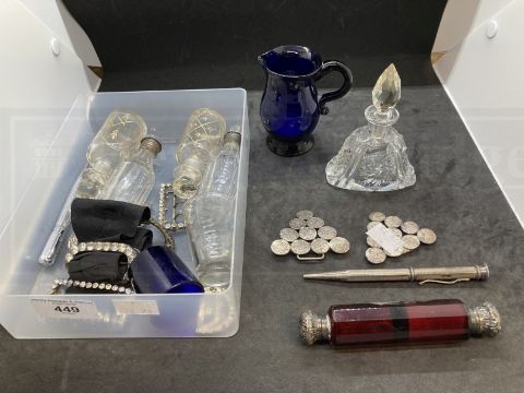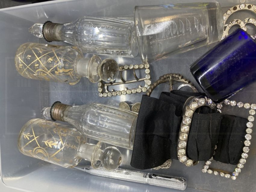 Objects of Virtu: Includes a Bristol Blue Glass jug, collection of scent bottles, shoe and belt buckles, two pens, one being a yard-of-lead, and a belt buckle made from silver coins.