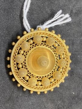 Jewellery: Yellow metal Victorian circular Tuscan style brooch with shot and wire work decoration, tests as 18ct gold. Weight 11.8g.