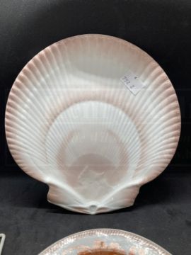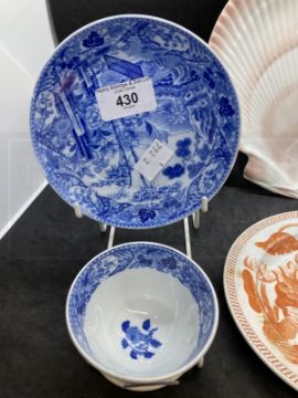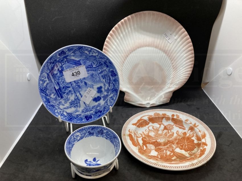 Ceramics: Early 19th cent. Wedgwood pearlware dishes one shaped like a scallop shell with pink decoration, the other printed in orange with the water lily pattern, and a Wedgwood blue and white transfer ware tea bowl. (3)