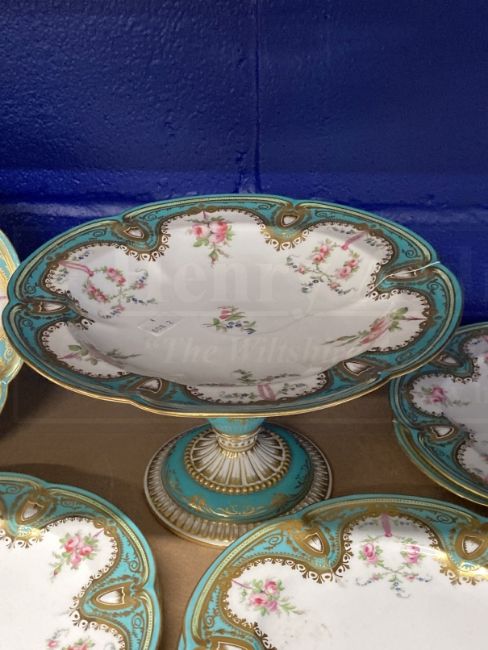 19th cent. English porcelain part dessert service decorated with flowers and gilt swags, pair of tazzas, a larger damaged tazza and six plates (1 A/F).