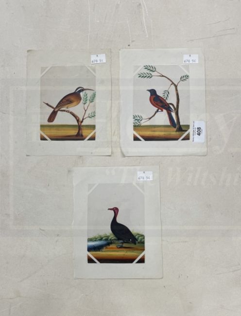 Company School: 19th cent. Indian mica paintings of birds, two of exotic birds on branches and another, possibly a purple moorhen. 5¼ins. x 5¼ins. (3)