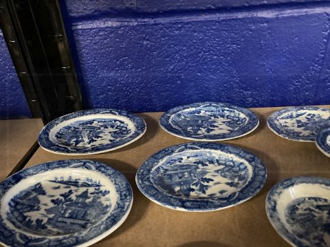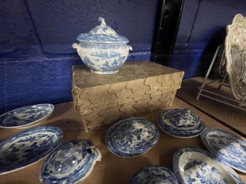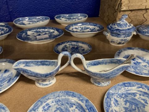 Ceramics: English c1840 blue and white pearlware Child's Play dinner service in period box, includes graduated meat plates, tureens, gravy boats, vegetable dishes, dinner plates and side plates. (49 pieces and 5 lids)