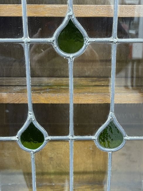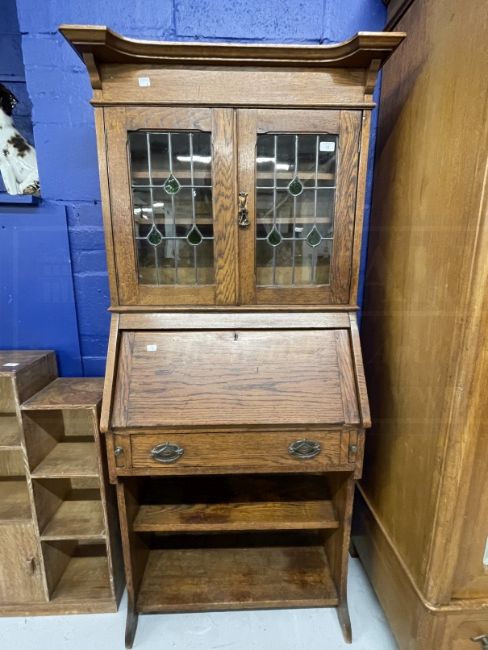 Arts and Crafts oak bureau bookcase of small proportions, leaded glass bookcase doors, the bureau with single drawer and two shelves. 66ins. x 31ins. Plus Late 19th cent. Mahogany overmantle with small scalloped shell shelves and an oval bevelled mirror. 44ins. x 27ins.