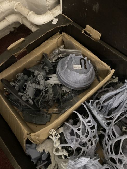 Toys & Games: Warhammer Fantasy Wargames, two boxes containing many incomplete and damaged warrior figures, 3D printed figures and spares and repairs.