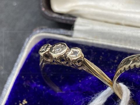 Jewellery: Yellow metal round locket with glass cover, wishbone ring size V, and a ring set with three tiny diamonds size V½, all test as 9ct gold. Total weight 10.6g.