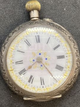 Watches: Gentleman's silver fob watch with engine turned back and two ladies fob watches. (3)