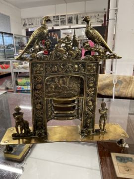 19th cent. Brass miniature fireplace, probably a travelling salesman's or an apprentice piece, the pediment with two pheasants, the fireplace flanked by historical figures.