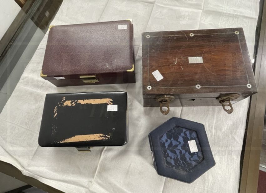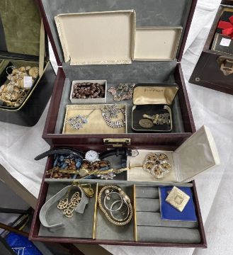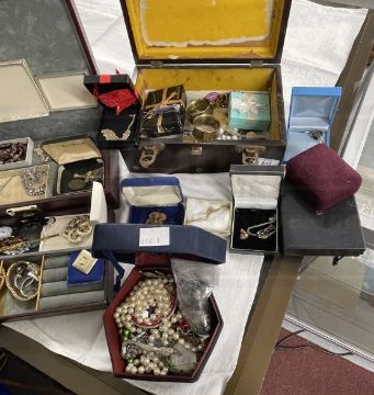 Costume Jewellery: Selection of various brooches, necklaces, rings, coins, etc. (4 boxes)