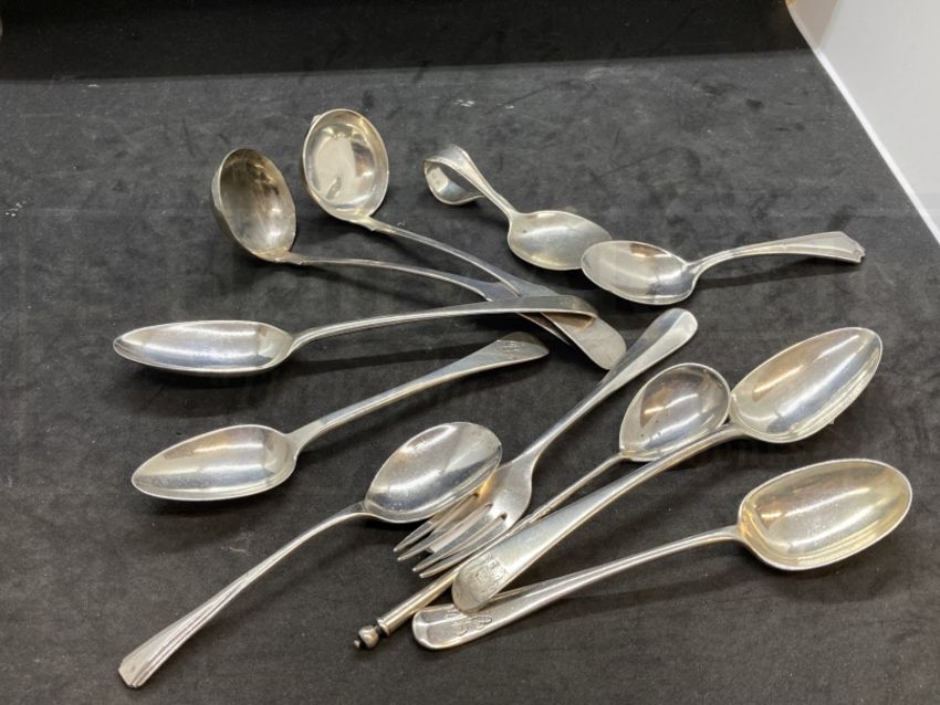 Hallmarked Silver: Pair of sauce ladles and various spoons, various hallmarks. Total weight 9.44oz.