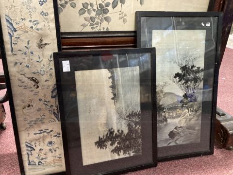 Late 19th/early 20th cent. Chinese hardwood screen pierced carving to the top and bottom inset with silk panels with painted flora and embroidered birds to both sides. 48½ins. x 32ins. Plus two small Yuzen Birodo mountain and river scenes and a Chinese embroidery on silk.