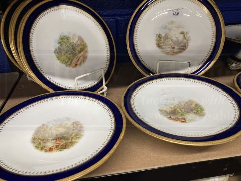 19th cent. Porcelain dessert service comports x 5, plates x 13, all with gilded edges and hand painted central scenes of landscapes with figures and boats, mountains and lakes, number 2191 in red to reverse. 9¼ins.