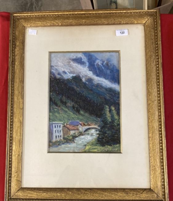 Wynford Dewhurst R.B.A (1864-1941): Pastel, mountain landscape with houses by a river, signed lower right W. Dewhurst, framed and glazed. 12½ins. x 8¾ins.
