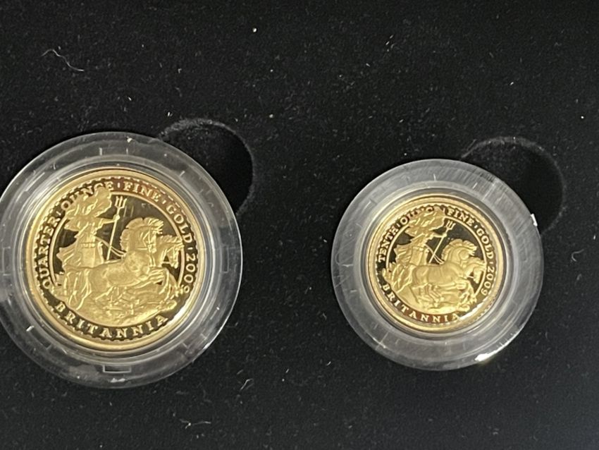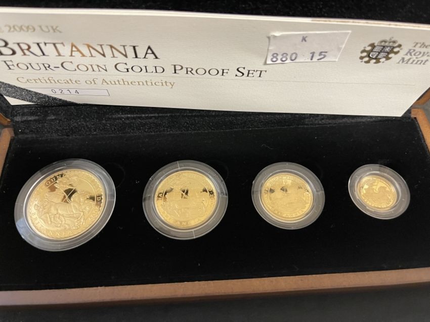 Coins/Numismatics: ROYAL MINT 2009 BRITANNIA FOUR COIN GOLD PROOF SET, containing denominations of £100 1oz, £50 1/2oz, £25 1/4oz, £10 1/10oz, issue number 214 of 1250, with box of issue and COA.
