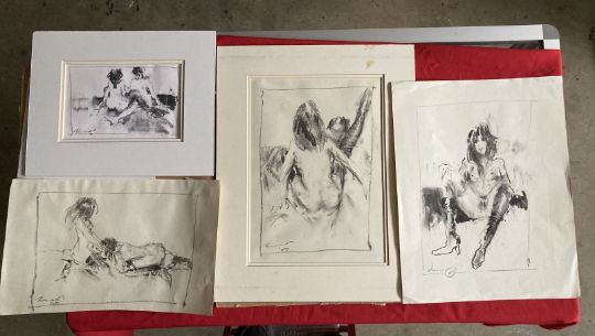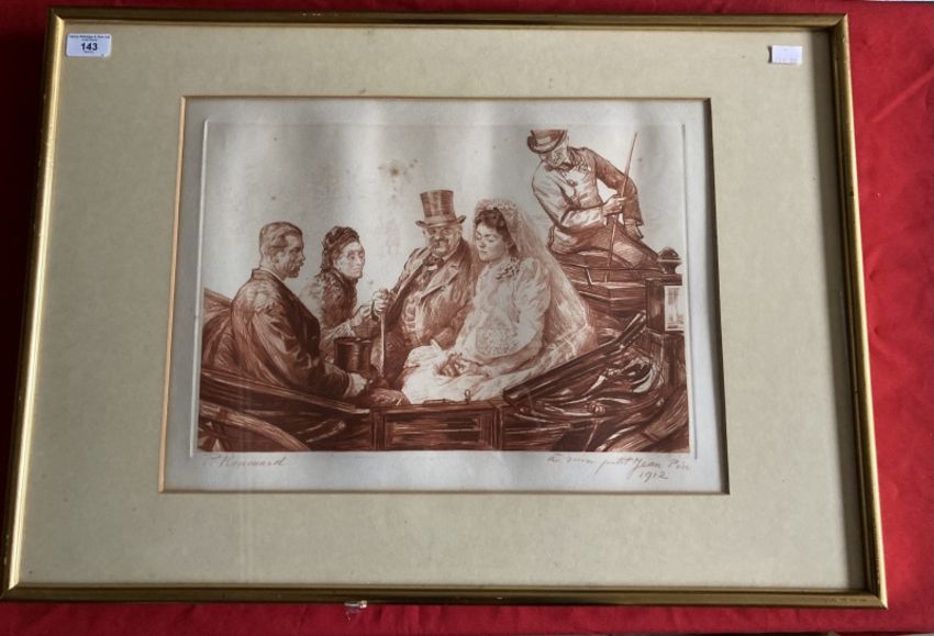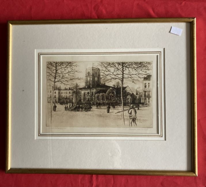Walter William Burgess (1856-1908): Etching, Chelsea Old Church, framed and glazed. 6½ins. x 10½ins. Jan Selman print, signed and dated 89 Morning Rains. P. Renouard print, marriage scene, framed and glazed, dated 1912. 11ins. x 17ins. (3) Plus six prints of nudes, two framed and glazed.