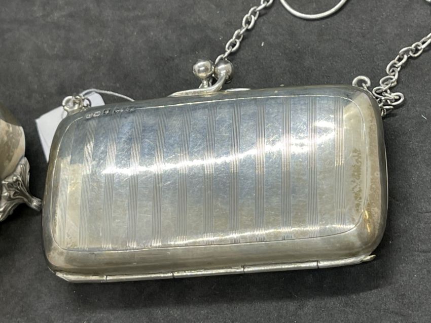 Hallmarked Silver: Edwardian solid silver purse with leather lining Birmingham 1913, G. Norman. 2.7ozt. Plus a silver oval trinket box on four shaped feet, engine turned lid, gilt interior, Chester 1910 Synger & Beddoes. 2.2ozt. Total 4.9ozt.