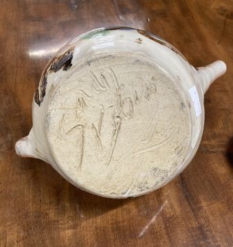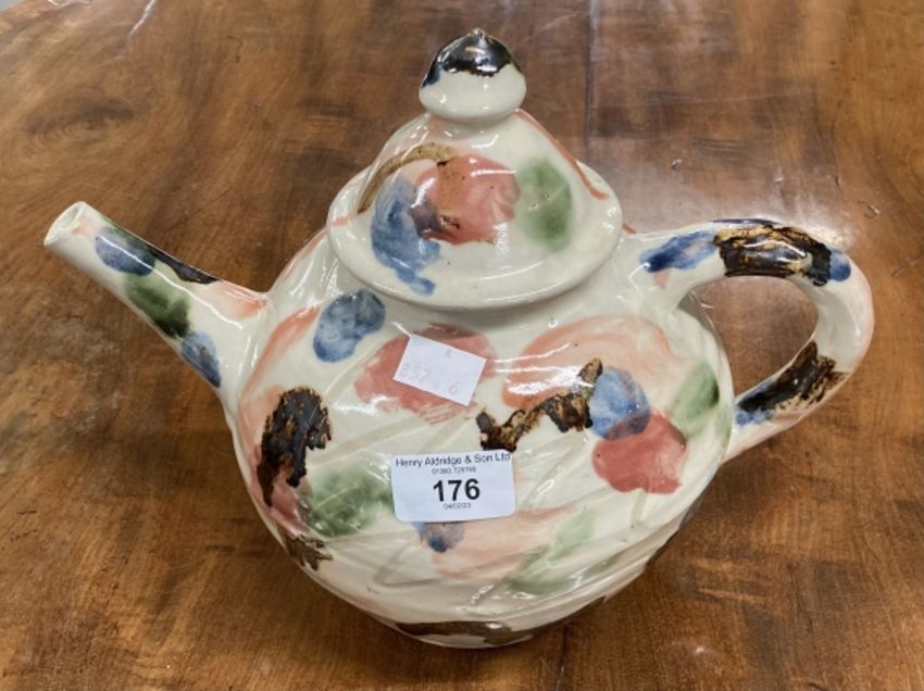 Sandy Brown b1946: Large teapot and cover, ovoid with incised and painted decoration, incised Sandy Brown signature. 9ins.
