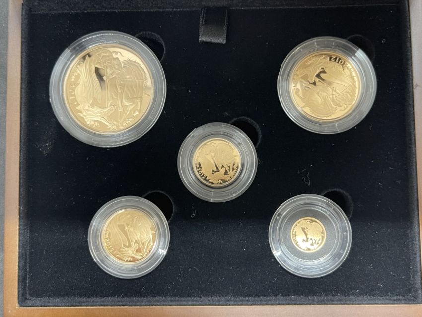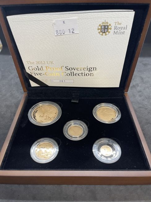 Coins/Numismatics: ROYAL MINT 2012 GOLD PROOF SOVEREIGN FIVE COIN COLLECTION, containing denominations £5, Double Sovereign, Sovereign, Half sovereign and a Quarter Sovereign, limited edition 261/1000, within box of issue with COA