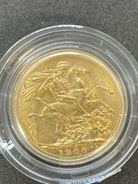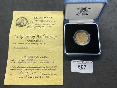 Coins/Numismatics: 1900 Queen Victoria gold full sovereign, veiled head, Melbourne mint mark in Royal Mail coin box and Coin craft COA