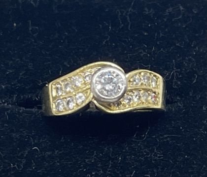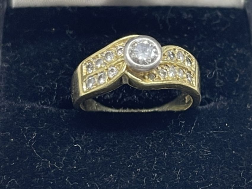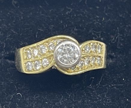 Jewellery: Yellow metal ring seventeen stone crossover, centre rub over set with a single brilliant cut diamond, estimated weight 0.35ct, each shoulder grain set with eight brilliant cut diamonds, estimated weight of (16) 0.32ct. Tests as 18ct gold stamped 18K. Ring size M. Weight of ring 5.9g.