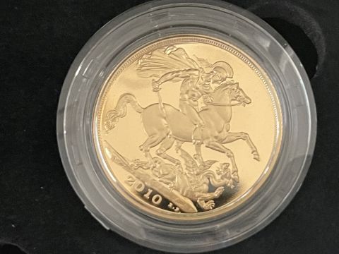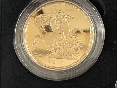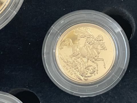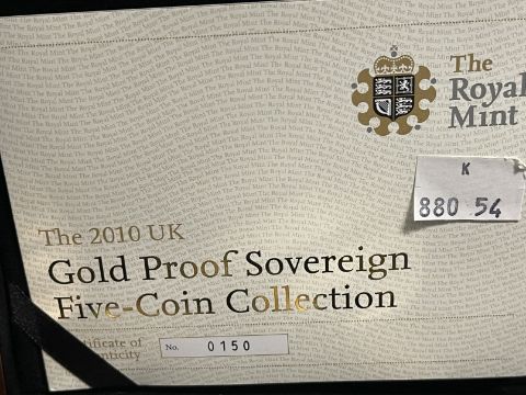 54 Coins/Numismatics: ROYAL MINT 2010 GOLD PROOF SOVEREIGN FIVE COIN COLLECTION, containing denominations £5, Double Sovereign, Sovereign, Half sovereign and a Quarter Sovereign, limited edition 0150/1750, within box of issue with COA.