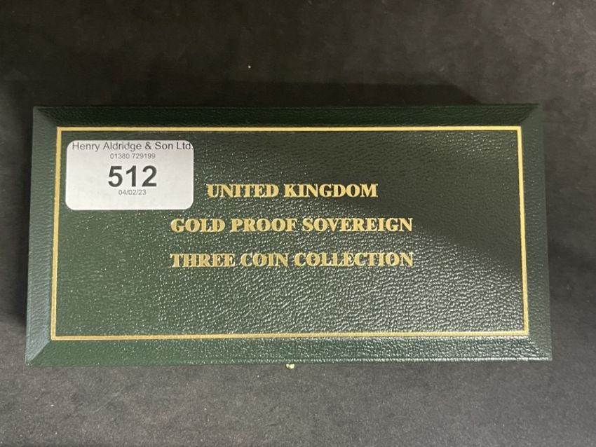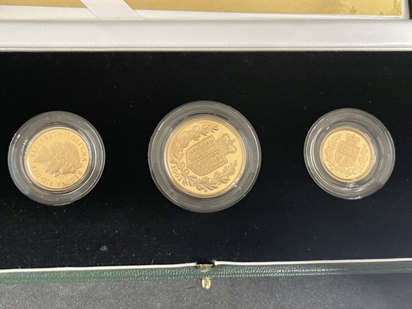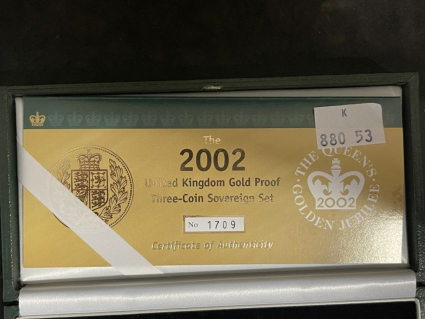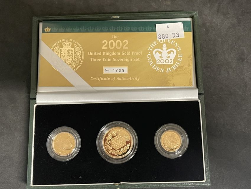 Coins/Numismatics: 2002 ROYAL MINT GOLD PROOF THREE COIN GOLDEN JUBILEE SOVEREIGN SET with Certificate of Authenticity, no. 1709 half sovereign (c.3.99grams), sovereign (c.7.98grams) and double sovereign (c.15.97grams) in the original Royal Mint box and capsules.
