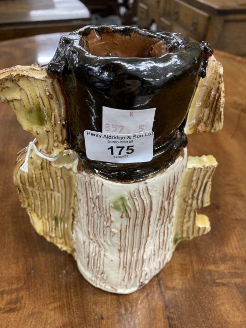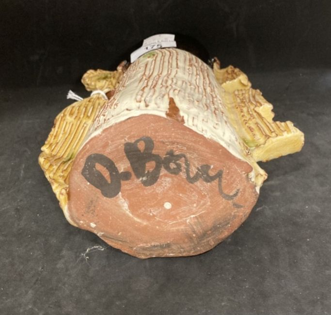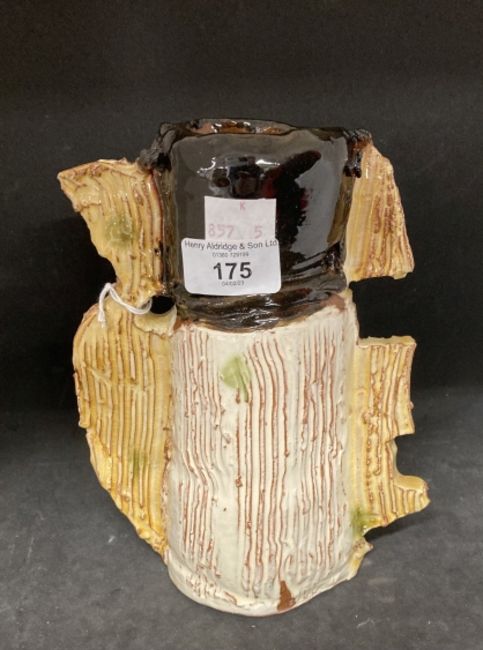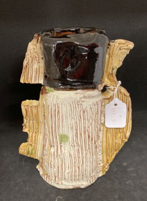 Dylan Bowen b1967: Earthenware vase with applied handles glazed yellow, cream and brown, painted D. Bowen mark. 8½ins.