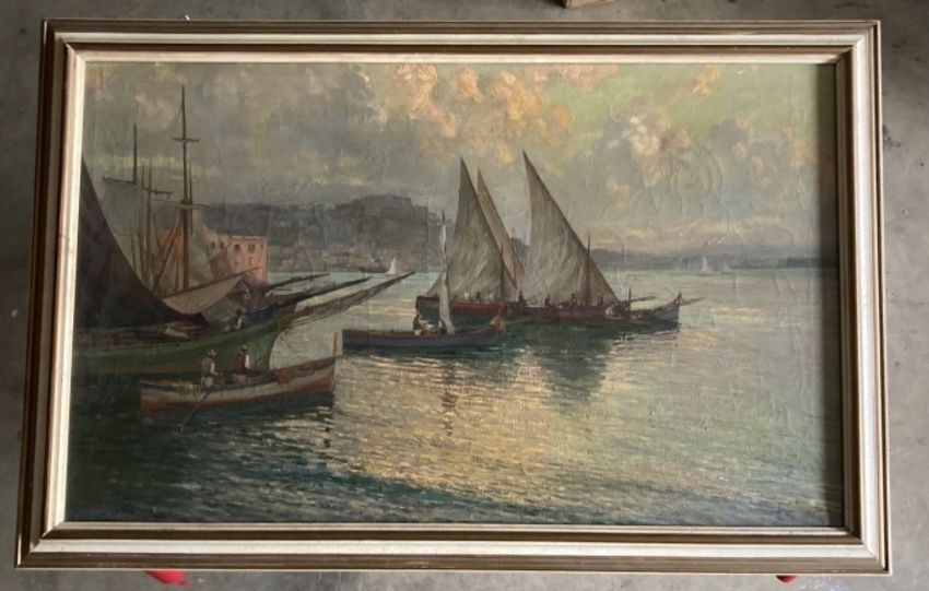 Early 20th cent. Welsh School: Oil on canvas, coastal study, fishing boats in a harbour, with indecipherable signature bottom right, label to reverse Swansea Fine Art Gallery, framed. 38ins. x 23ins.