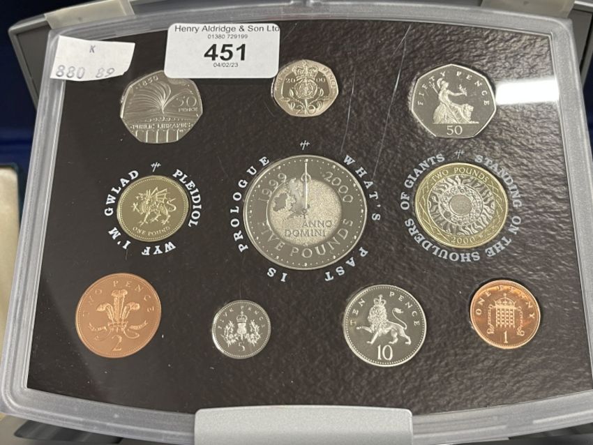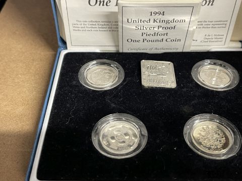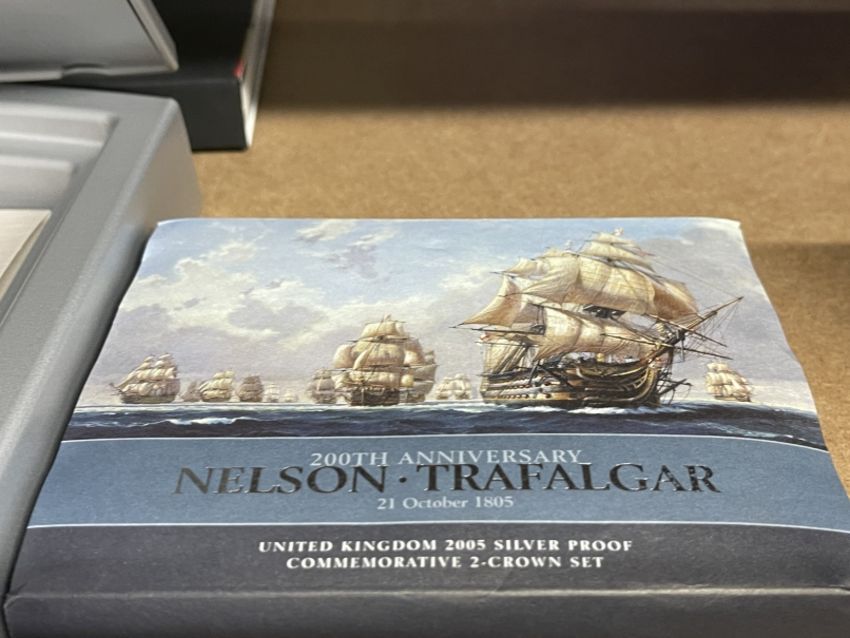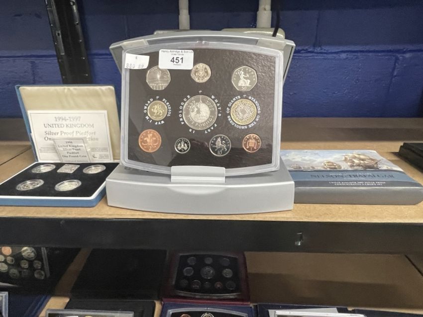 Coins/Numismatics: Silver and other to include 1994-1997 piedfort proof one pound collection boxed with COA, 2000 silver proof pound coin, three crowns one Victoria 1892, Nelson Trafalgar proof crown, 2013 UK annual coin set (mint condition coins of the year and Royal Mint boxed 2000 executive proof coin collection.
