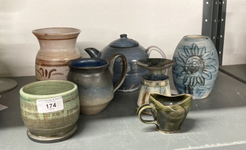 Robert David Muspratt-Knight: Studio Pottery Pupil of Francis G. Cooper, fawn vase 6ins, waisted vase 4ins, green bowl 3ins, cup 4ins, small jug and flow glaze teapot with lid 5ins. (6)