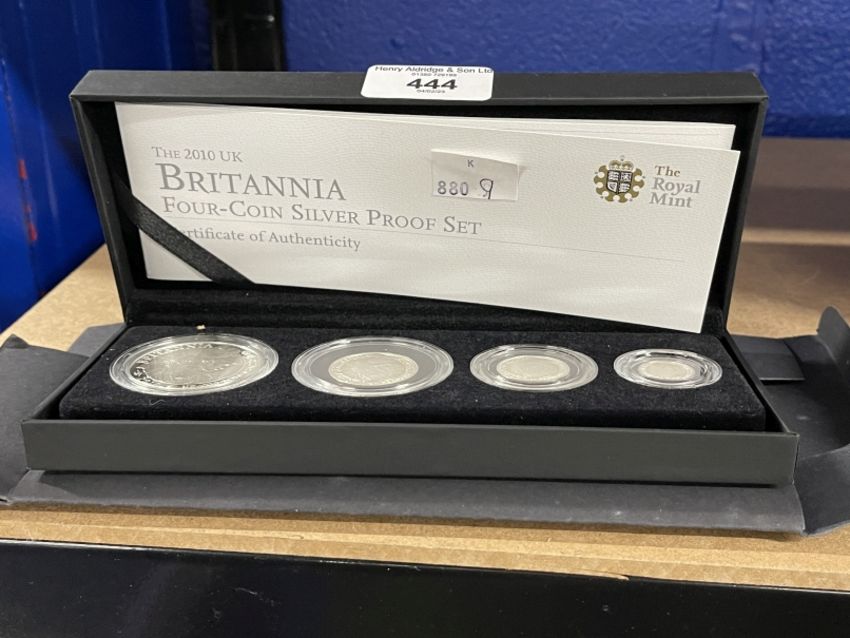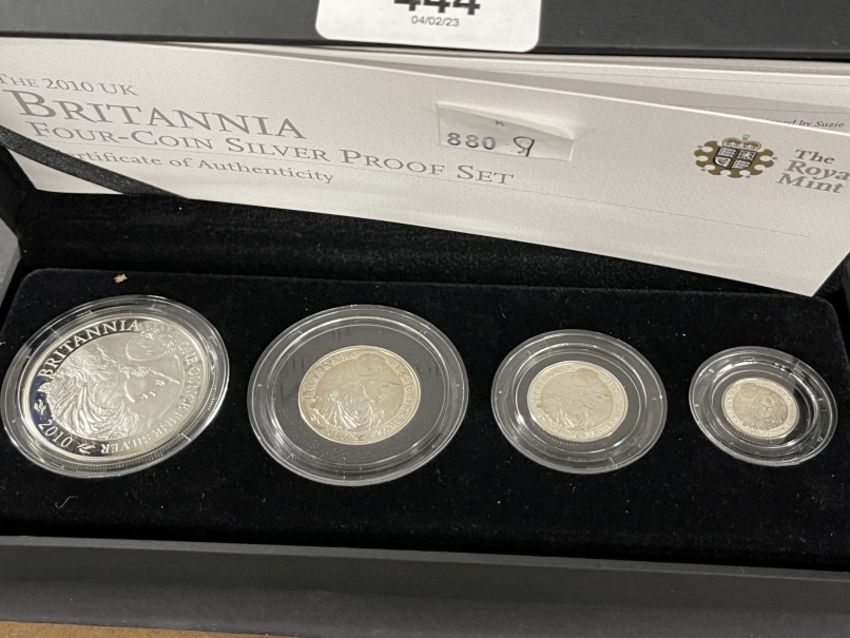 Coins/Numismatics ROYAL MINT; 2010 UK Britannia four-coin silver proof set, comprising £2, £1, 50p and 20p, in presentation case with booklet.