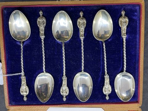 Hallmarked Silver: Set of six spoons with soldiers as handles, Birmingham 1899, cased. 37 grams