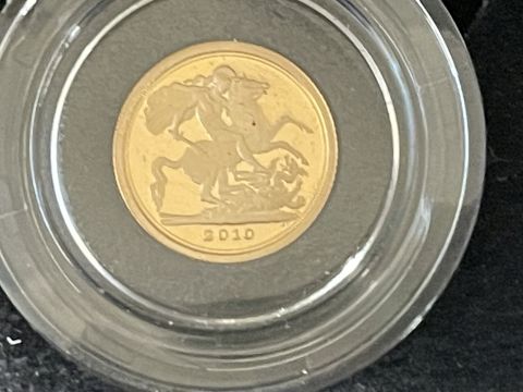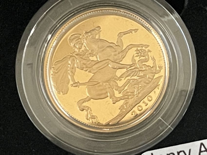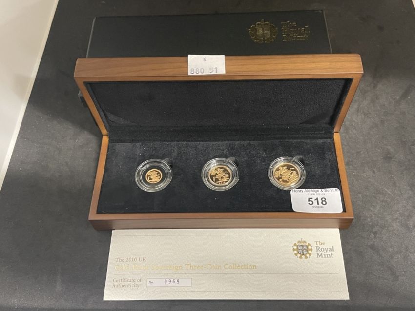 Coins/Numismatics: 2010 UK Gold Proof Sovereign Three-Coin Collection, comprising Gold Full Sovereign, Gold Half-Sovereign and Gold Quarter Sovereign, depicting St George and the Dragon, ltd ed 0969/1500, with COA, in fitted box with outer case.