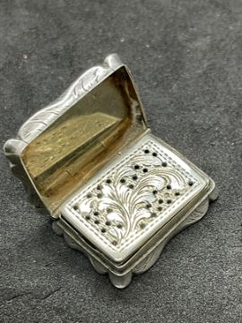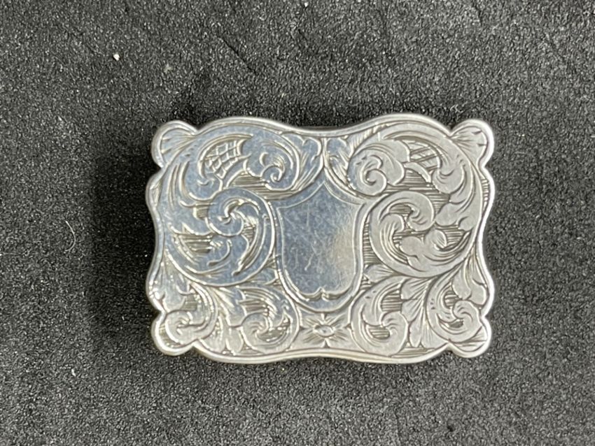 Early 19th cent. White metal vinaigrette, shaped edge, engraved decoration to the front and back, the front with an unadorned central shield. 1?ins. x ¾ins.