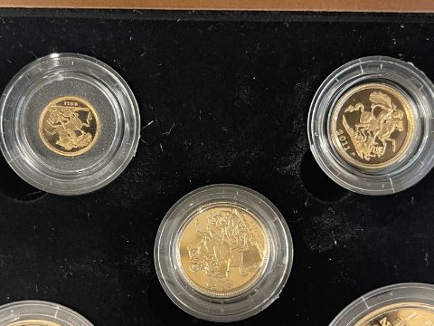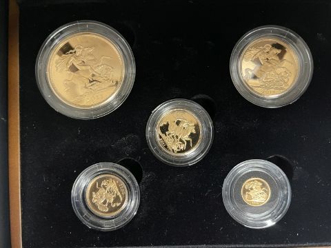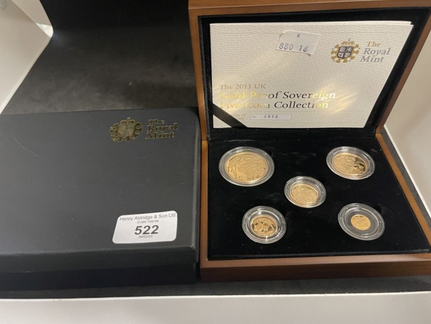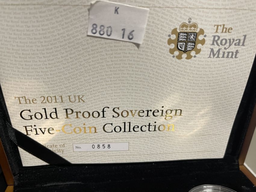 Coins/Numismatics: ROYAL MINT 2011 GOLD PROOF SOVEREIGN FIVE COIN COLLECTION, containing denominations £5, Double Sovereign, Sovereign, Half sovereign and a Quarter Sovereign, limited edition 858/1500, within box of issue with COA