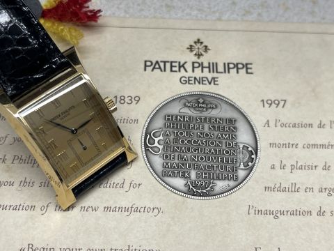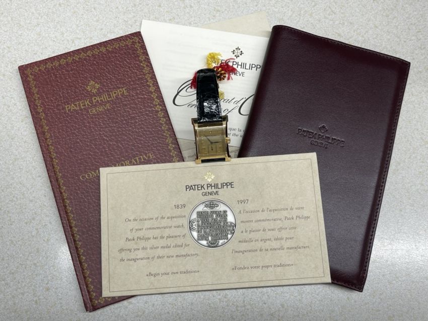 Clocks and Watches: Patek Philippe 'Pagoda' Commemoration 1997 limited edition 18ct gentleman's wristwatch, ref. 5500, Roman numeral champagne dial with subsidiary seconds dial, cal. 215 mechanical 18 jewel movement, no. 1,858,xxx, case no. 4,013,xxx, black leather strap with 18ct Patek Philippe buckle, 41mm x 28mm-** In excellent condition with the original bi-fold presentation box and outer cover, tags, Certificate of Origin, Attestation Certificate, Chronometer certificate dated 20/03/1997, Commemorative Watches book, Commemorative 1839-1997 silver medal and booklets -** Specially produced in 1997 to mark the inauguration of Patek Phillippe's new watchmaking centre in Geneva. This watch is one of a series of 1100 produced in yellow gold-Excellent condition, the related papers are unstamped.